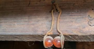 I found this hanging from the basement rafters of my 100 year old house. It appears to be two marbles or something similar in a hanger of some sort. Any one have a clue what this could be?”